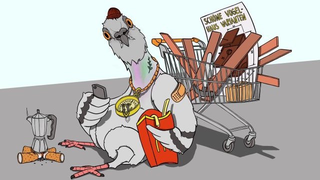 Inspiriert von der Liebe zum Comic und zur Typografie setzt Martin Tiziani die Tauben pointiert und augenzwinkernd in Szene. Die Arbeiten bewegen sich dabei zwischen Illustration, Wandbild und Installation und laden dazu ein, den Blick auf diese oft übersehenen Stadttiere neu zu hinterfragen.